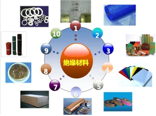 绝缘材料:绝缘漆、浸渍树脂、树脂浸渍纤维制品、层压制品、卷绕制品、电工塑料、橡胶、云母制品、薄膜、柔软复合材料、粘带、绝缘纸板、绝缘液体等。