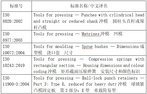 ISO/TC29/SC8(冲模和成型模分技术委员会)目前有5项标准正在开展复审投票,项目清单如下: