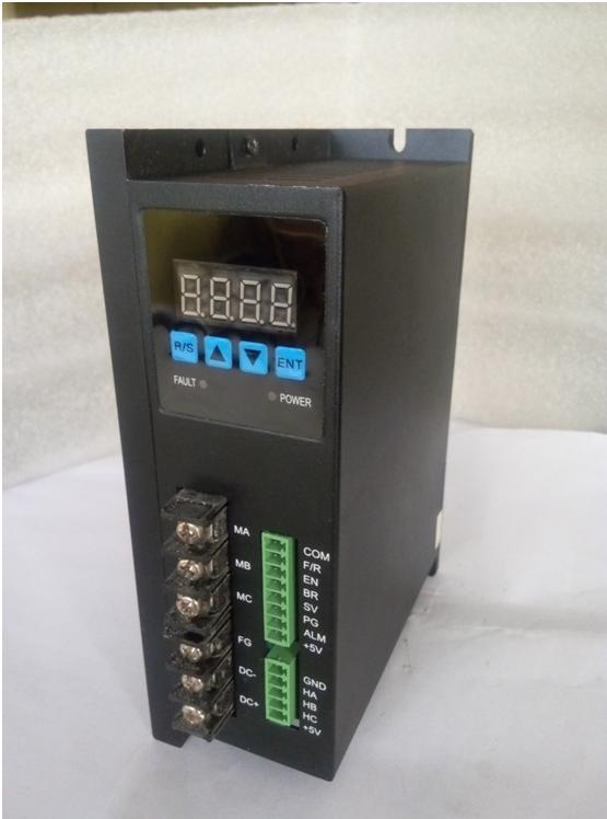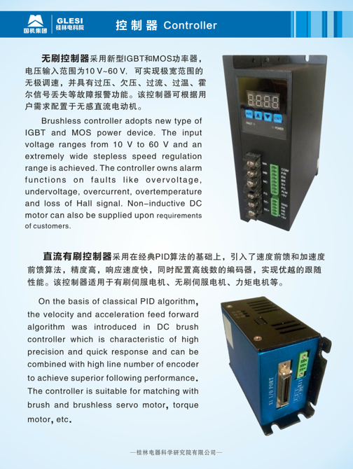 无刷控制器采用新型IGBT和MOS功率器,电压输入范围为10 V~60 V,可实现极宽范围的无极调速,并具有过压、欠压、过流、过温、霍尔信号丢失等故障报警功能。该控制器可根据用户需求配置于无感直流电动机。