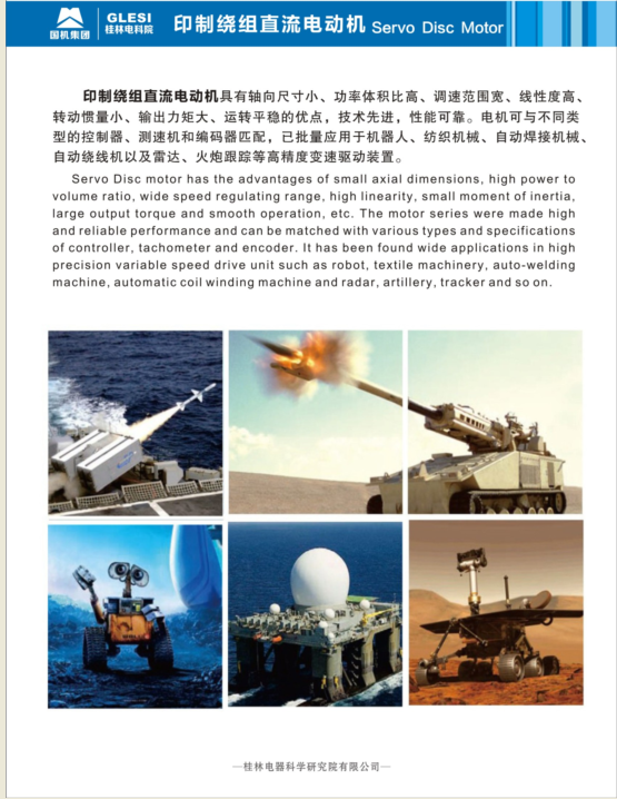 印制绕组直流伺服电动机具有轴向尺寸小、功率体积比高、调速范围宽、线性度高、转动惯量小、输出力矩大、运转平稳等优点,技术性能先进可靠。电机可与不同类型规格的控制器、测速机和编码器匹配,已批量应用于机器人、纺织机械、自动焊接机械、自动绕线机以及雷达、火炮、跟踪器等高精度变速驱动装置。